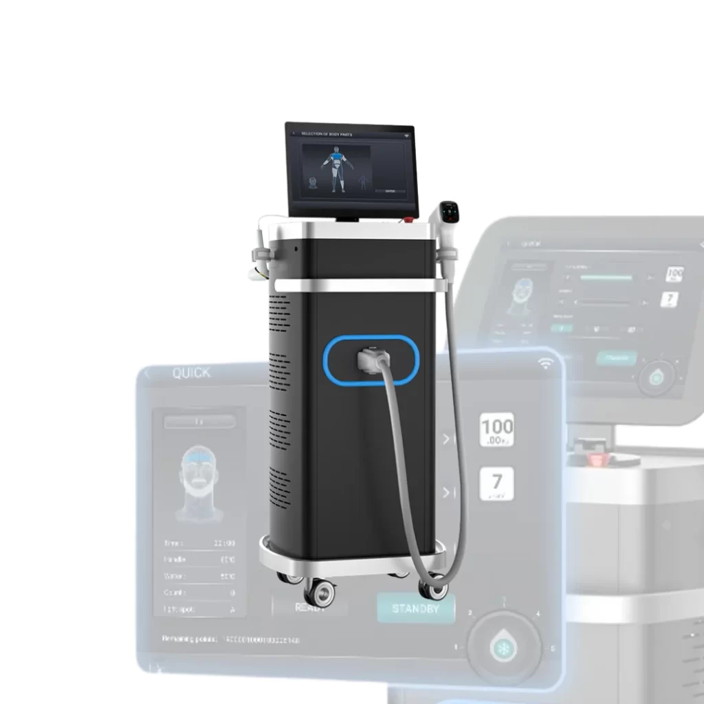 Láser diodo de depilación con 4 longitudes de onda (755/808/940/1064 nm) y sistema Android para operación ágil y registro de datos clínicos.
